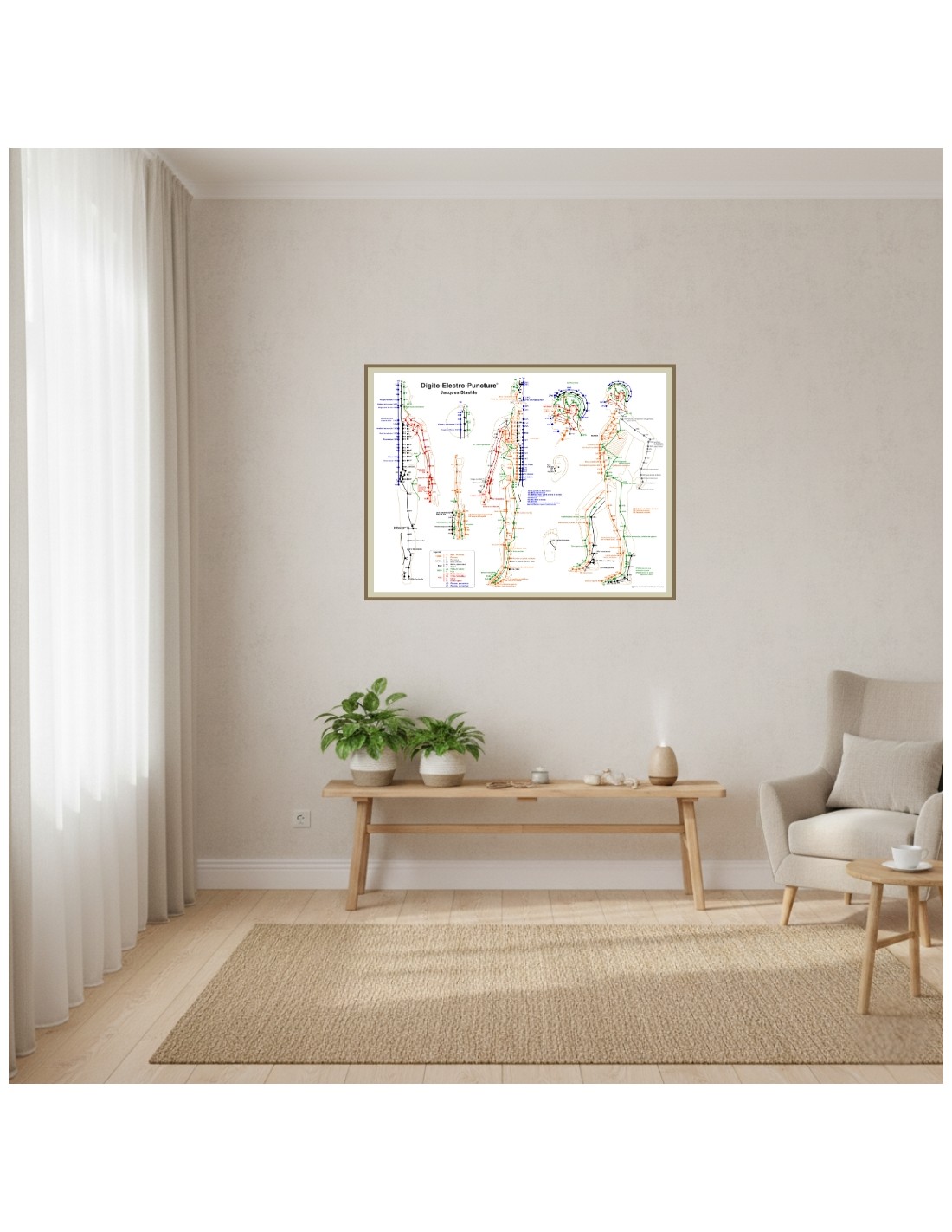 Découvrez ce poster grand format (80 x 60 cm), indispensable pour tous les praticiens de digitopuncture et passionnés de médecine chinoise. Ce support visuel vous présente clairement la carte des méridiens et points d’acupuncture, avec un nouveau design coloré respectant les couleurs traditionnelles de la loi des 5 éléments (Bois, Feu, Terre, Métal, Eau).